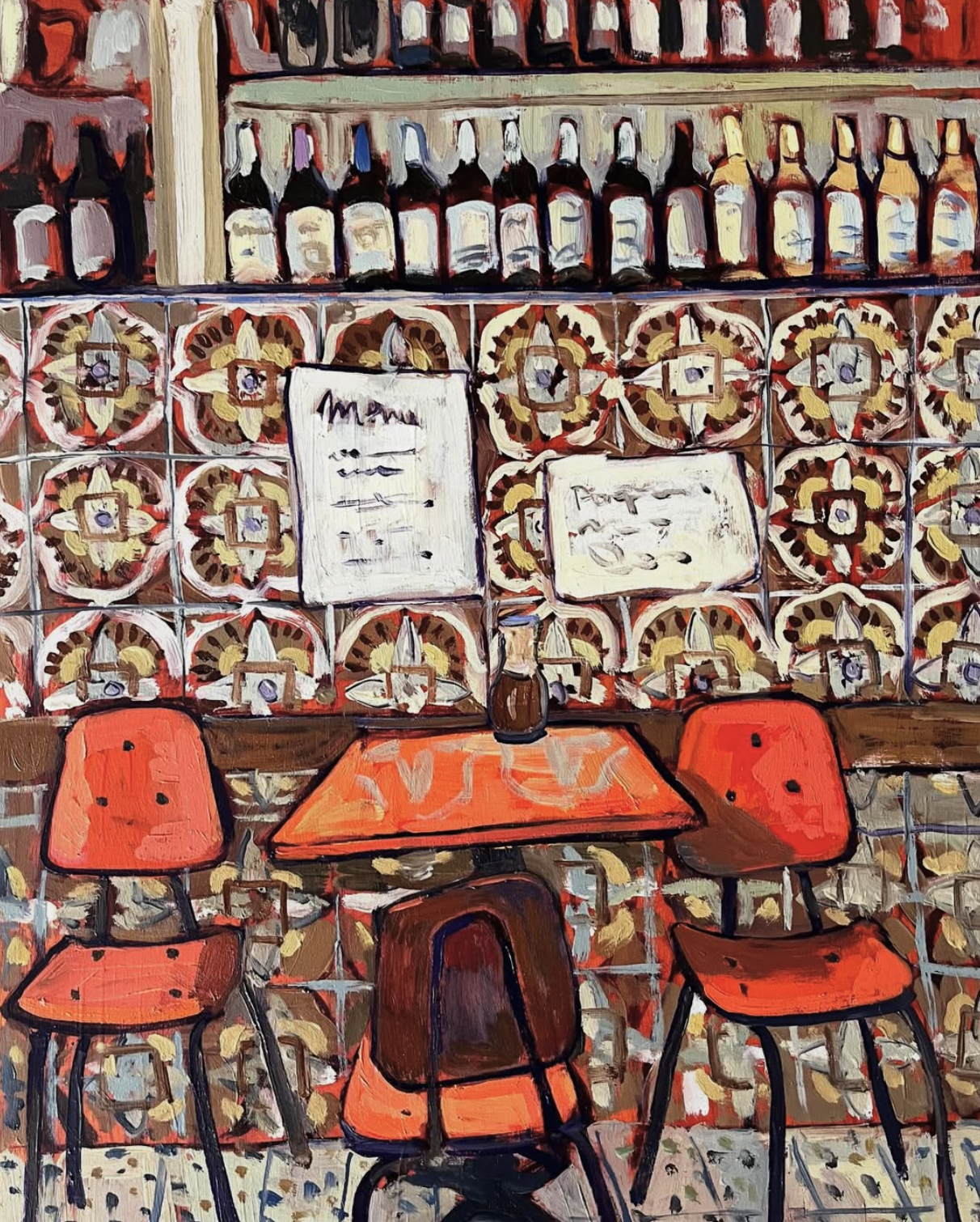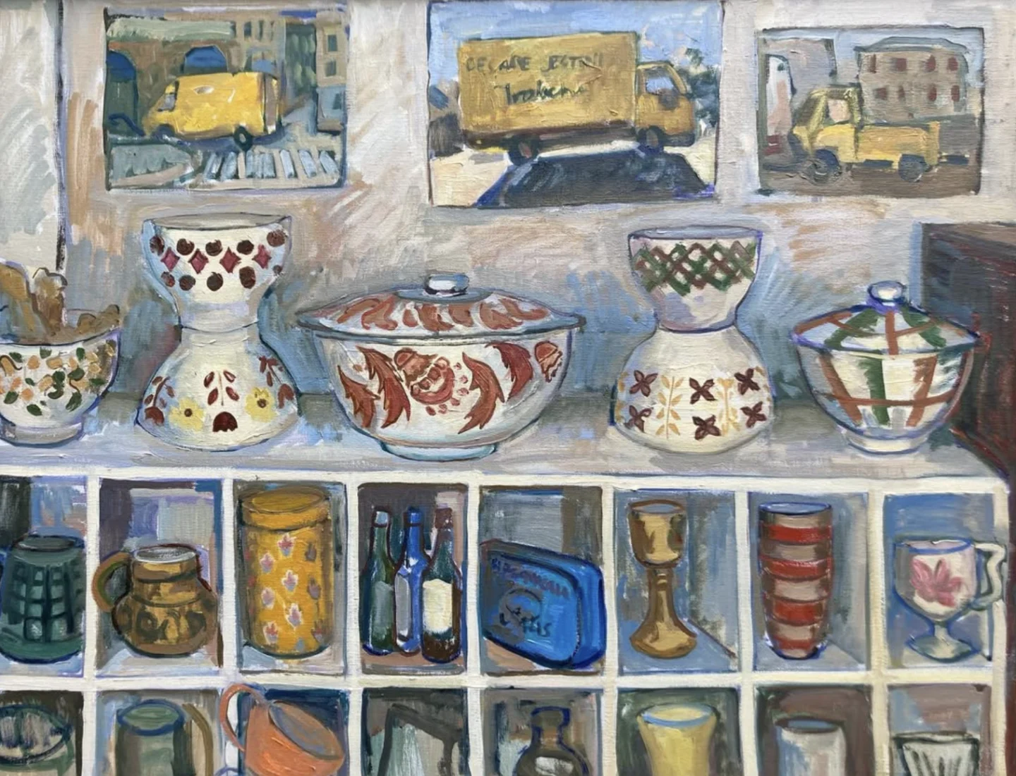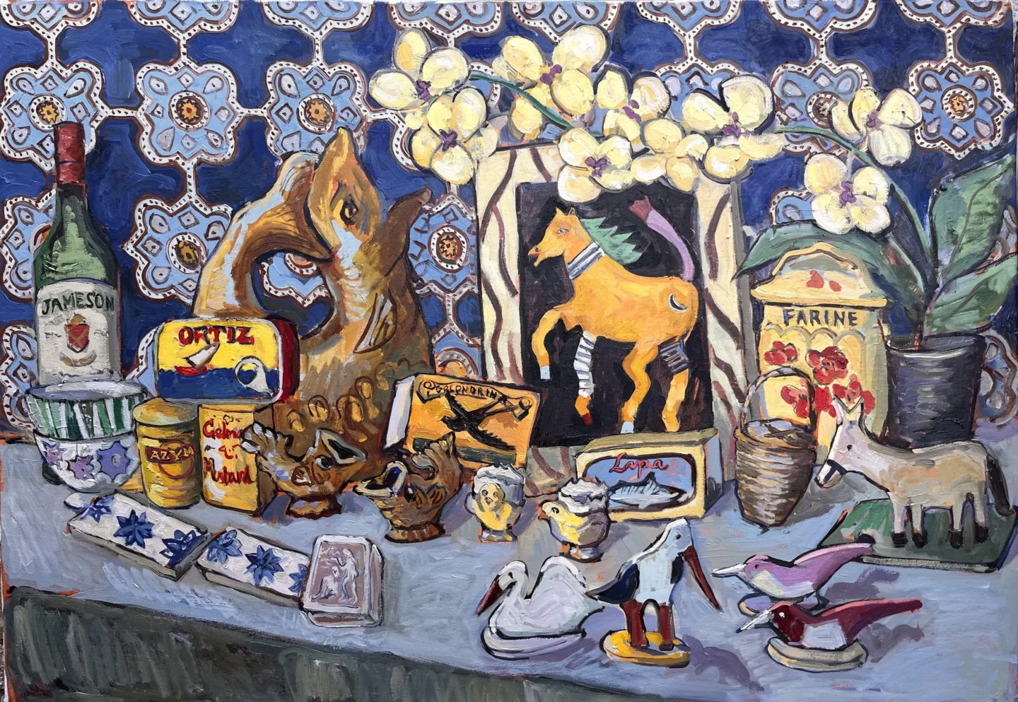 Your work mostly depicts home interiors; whether that be a dining table or a shelving unit with unique objects on it. Do you think growing up with antique dealers as parents has been influential to both you and your work?