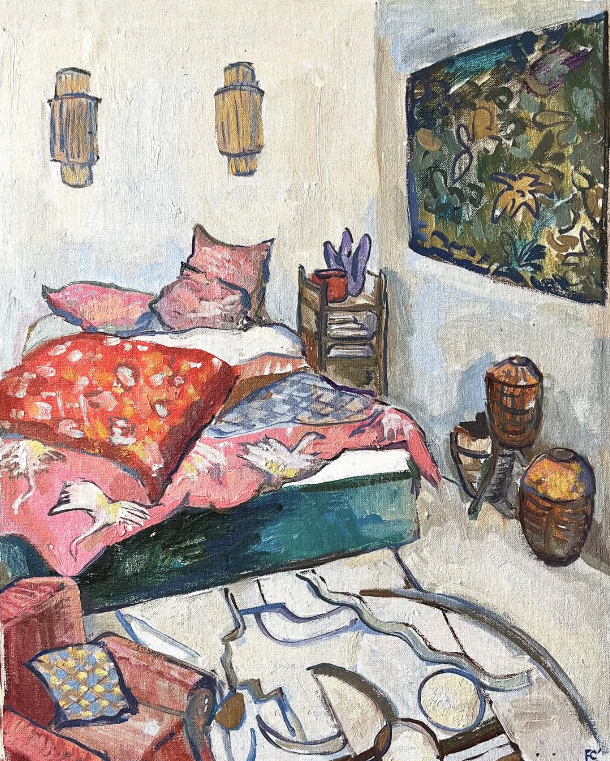 In my work I am instantly drawn to spaces or scenes with a strong and unique identity, where beauty and quirkiness are valued above pure functionality. When looking at my paintings many people say they feel like they can plunge into a scene, or that it awakens feelings of nostalgia and comfort in them. An unmade bed allows them to imagine someone has just climbed out it leaving the sheets rumpled, a messy kitchen reminds them of their own after a delicious spread has been prepared.